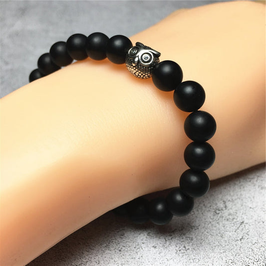 Natural Matte Onyx Gemstone Elastic Handmade Beaded Bracelet Adjustable Bracelet Owl Design
