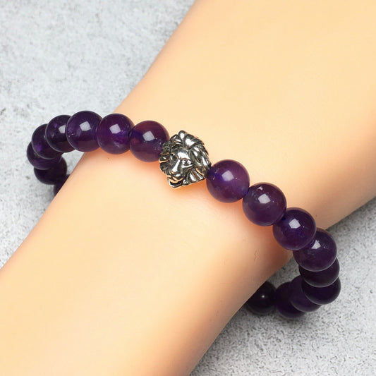 Natural Purple Amethyst Beaded Bracelet Elastic Adjustable Gemstone Bracelet Lion Style