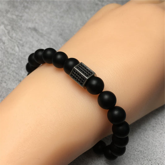 Black Matte Onyx Stone Beads with Black Striped CZ Charms Elastic Rope Handmade Bracelets