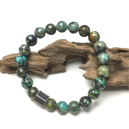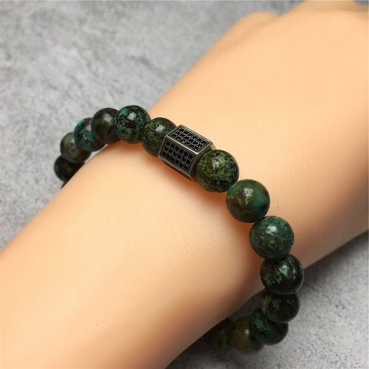 African Turqoiuse Stone Beads with Black Striped CZ Charms Elastic Rope Handmade Bracelets
