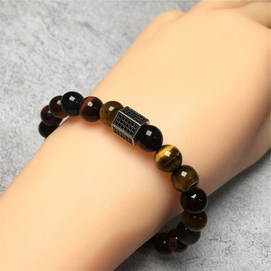 Multi Color Tigereye Stone Beads with Black Striped CZ Charms Elastic Rope Handmade Bracelets