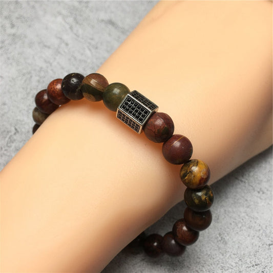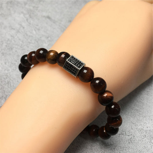 Red Tiger Eye Stone Beads with Black Striped CZ Charms Elastic Rope Handmade Bracelets