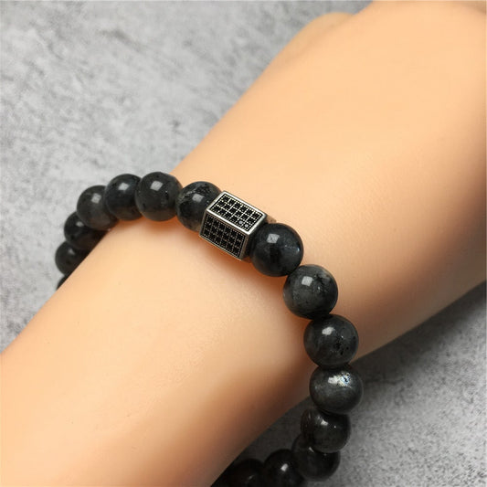 Labradorite Stone Beads with Black Striped CZ Charms Elastic Rope Handmade Bracelets