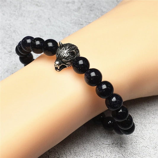 Natural Blue Sandstone Gemstone with Wolf Charm Spacer Bracelets Elastic Stretch Bracelet