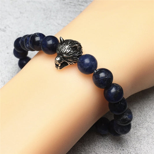 Natural Blue Sodalite Gemstone with Wolf Charm Spacer Bracelets Elastic Stretch Bracelet