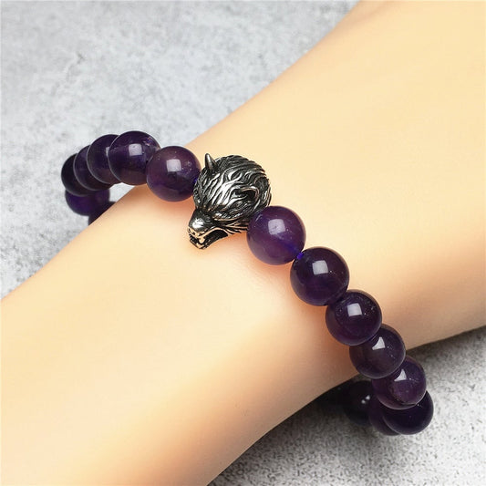 Natural Purple Amethyst Gemstone with Wolf Charm Spacer Bracelets Elastic Stretch Bracelet