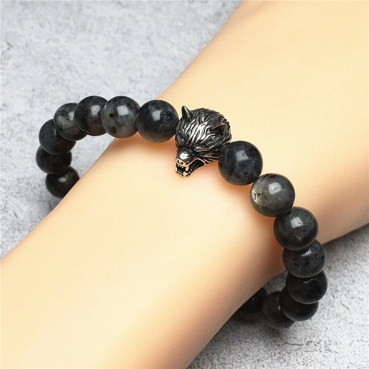 Natural Labradorite Gemstone with Wolf Charm Spacer Bracelets Elastic Stretch Bracelet