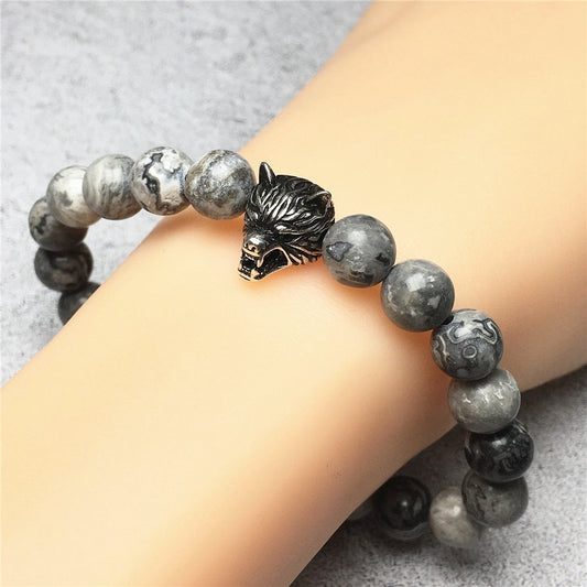 Natural Map Stone Gemstone with Wolf Charm Spacer Bracelets Elastic Stretch Bracelet