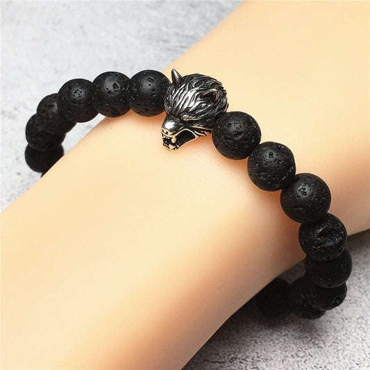 Natural Lava Stone Gemstone with Wolf Charm Spacer Bracelets Elastic Stretch Bracelet