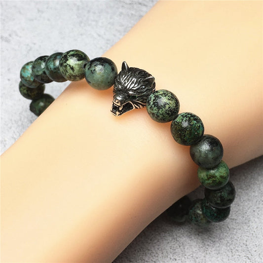 Natural African Turquoise Gemstone with Wolf Charm Spacer Bracelets Elastic Stretch Bracelet