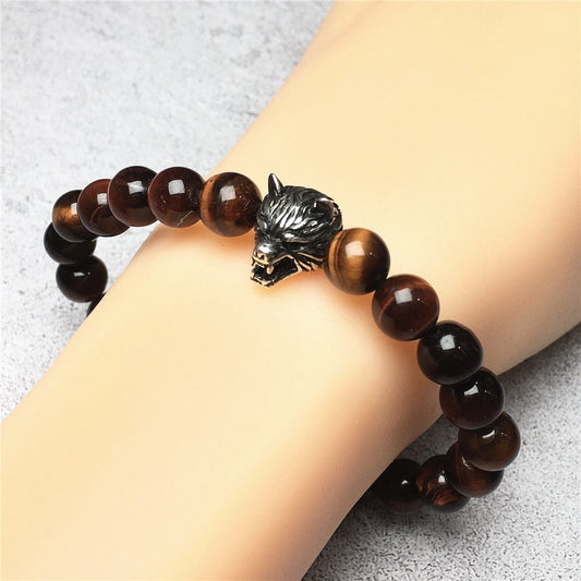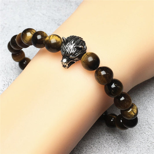 Natural Tiger Eyes Gemstone with Wolf Charm Spacer Bracelets Elastic Stretch Bracelet