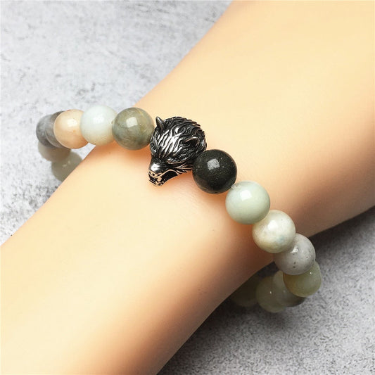 Natural Amazonite Gemstone with Wolf Charm Spacer Bracelets Elastic Stretch Bracelet