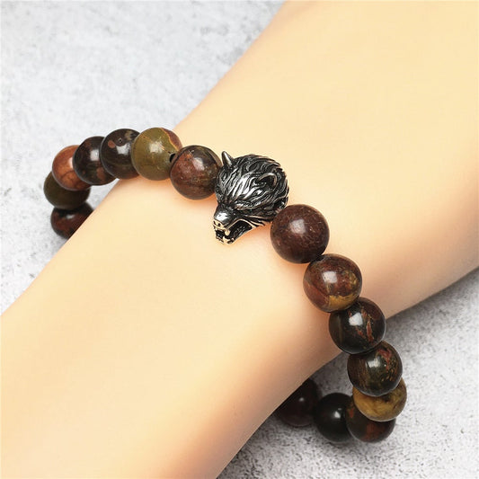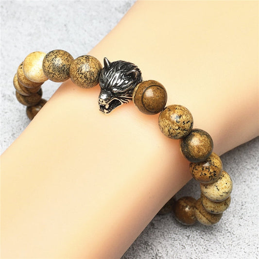 Natural Picture Jasper Gemstone with Wolf Charm Spacer Bracelets Elastic Stretch Bracelet