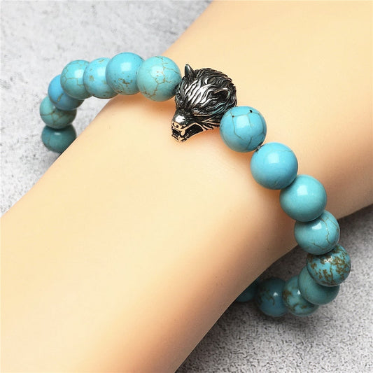 Natural Blue Turquoise Gemstone with Wolf Charm Spacer Bracelets Elastic Stretch Bracelet
