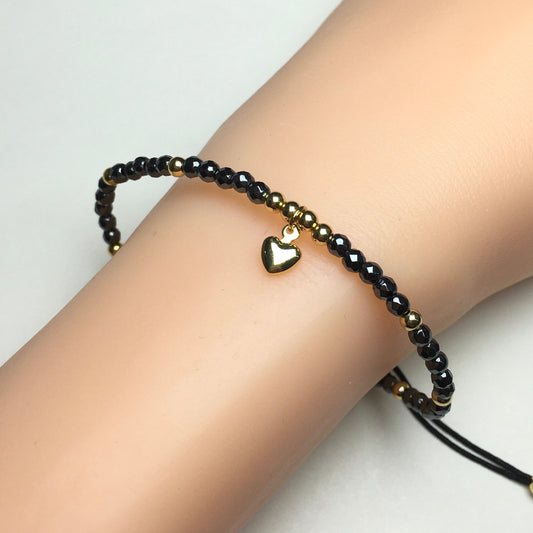 Hematite Gemstone Braid Rope Macrame Adjustable Bracelet Tiny Beads Gemstone Bracelet with Love Heart Charm