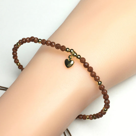 Gold Sandstone Gemstone Braid Rope Macrame Adjustable Bracelet Tiny Beads Gemstone Bracelet with Love Heart Charm