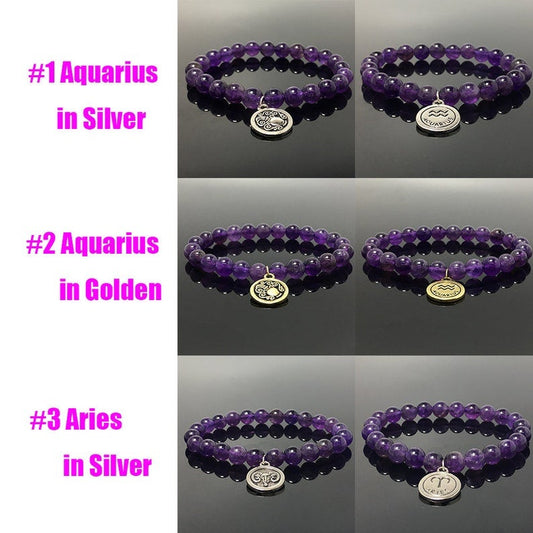 Purple Amethyst Bead Zodiac Bracelet Horoscope HD Charm Stretchy Gemstone Bracelet Celestial Astrology Constellation Jewelry