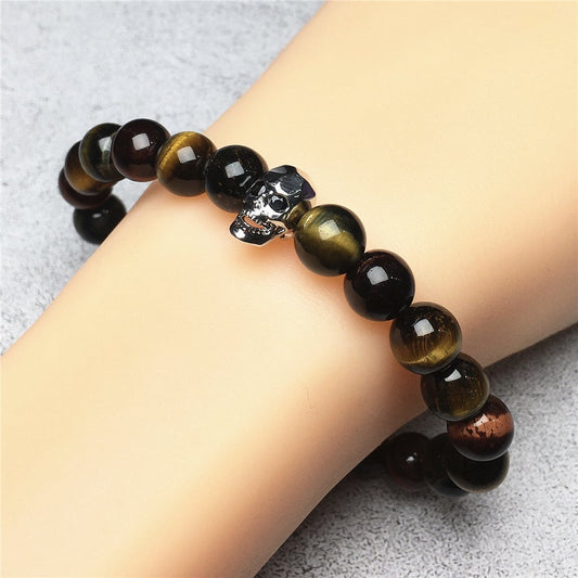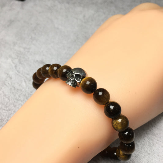 Tiger’s Eye Gemstone Unisex Handmade Stretch Bracelet Imperial Skull Charm