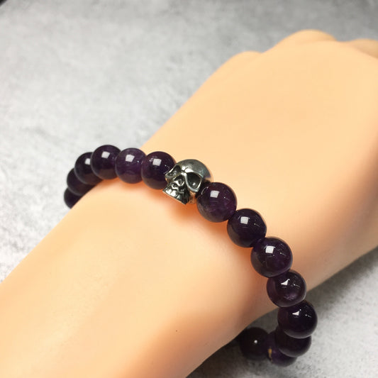 Purple Amethyst Gemstone Unisex Handmade Stretch Bracelet Imperial Skull Charm