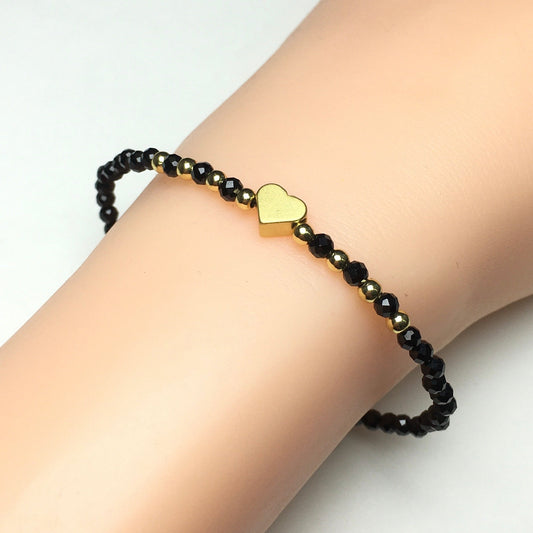 Black Spinel Gemstone Adjustable Beaded Bracelet with Love Heart Charm