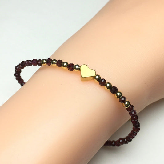Garnet Gemstone Adjustable Beaded Bracelet with Love Heart Charm