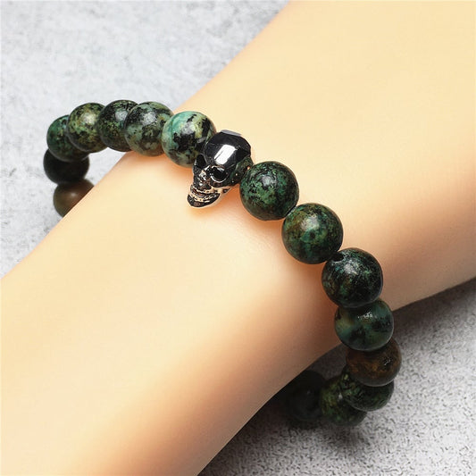 African Turqoiuse Gemstone Skinny Skull Charm Beaded Stretch Bracelet