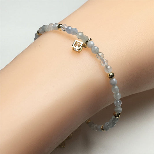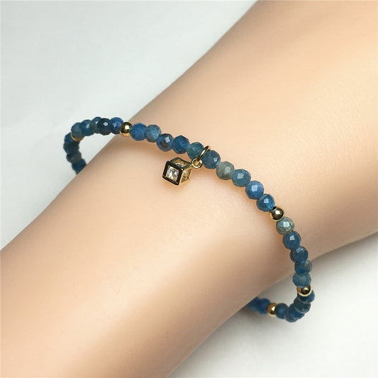 Blue Apatite Gemstone with Rhinestone Charm Adjustable Beaded Bracelet