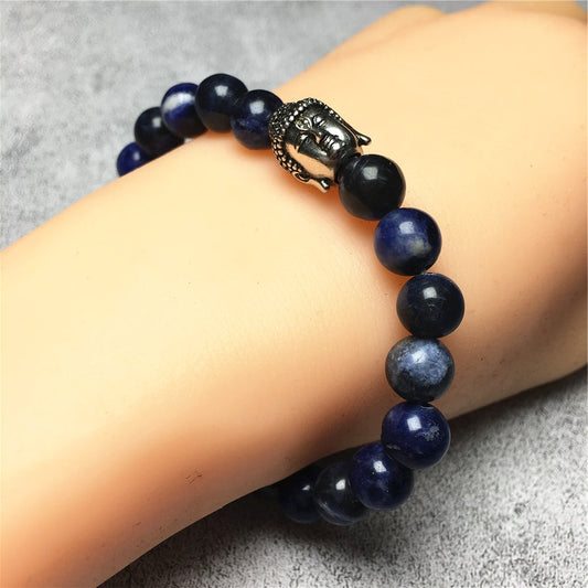 Sodalite Gemstone with Buddha Head Charm Handmade Elastic Bracelet