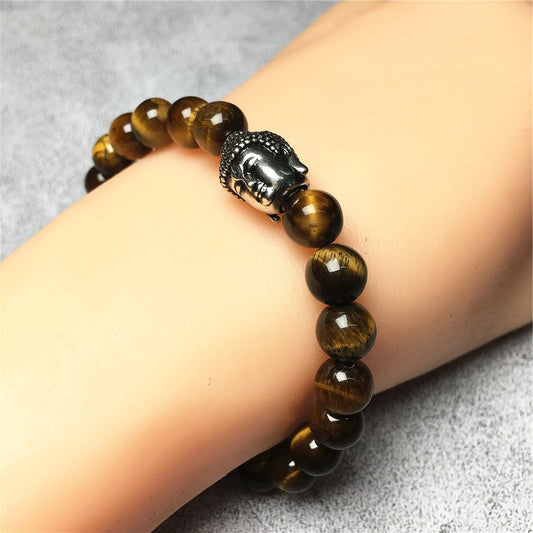 Buddha Head Charm Tiger Eye Stone Handmade Elastic Bracelet