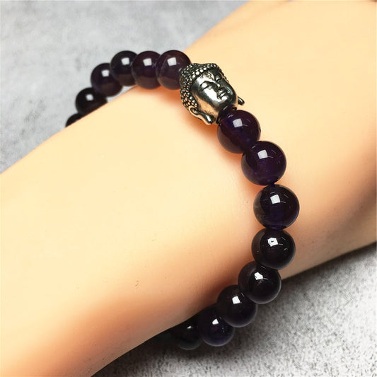 Purple Amethyst Gemstone with Buddha Head Charm Handmade Elastic Bracelet