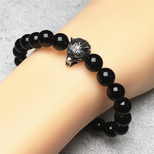 Natural Black Onyx Gemstone with Wolf Charm Bracelets Elastic Jewelry