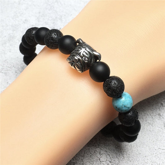 Matte Onyx Lava Stretch Beaded Handmade Precious Bracelets Jewelry with Bulldog