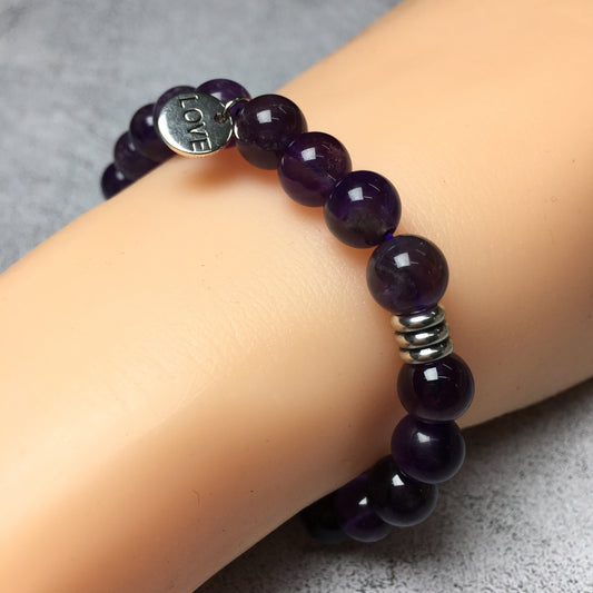 Gemstone Purple Amethyst Custom Beads Bracelet Love Heart Charm Stretch Bracelets