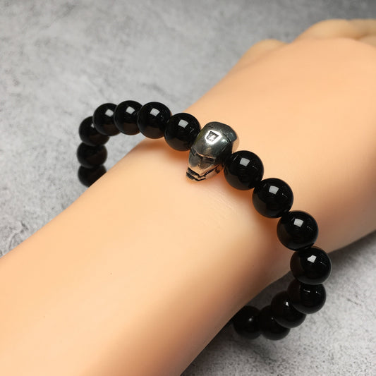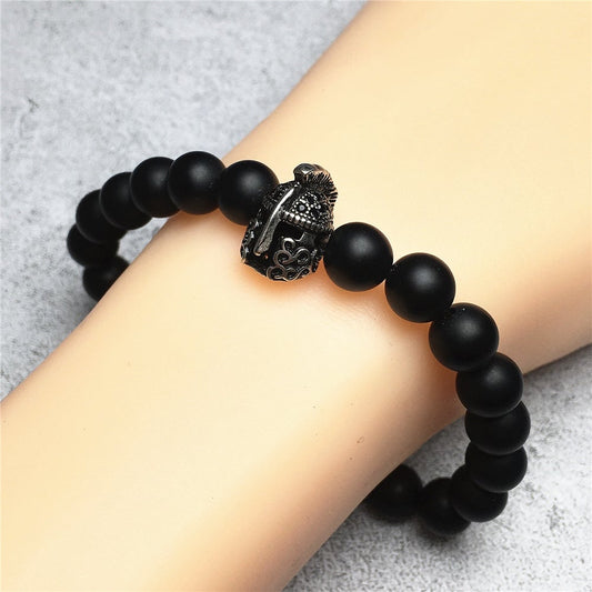 Matte Onyx Gemstone Beaded Bracelet Elastic Stretch Bracelet Spartan Helmet Design
