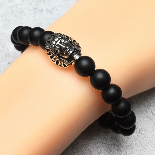 Natural Stone Bracelets Indian Head Bracelet Black Matte Onyx Beads Elastic Women Men Jewelry