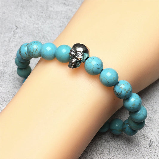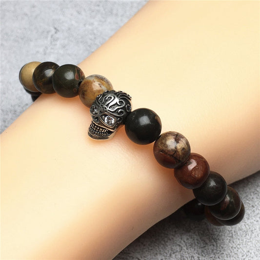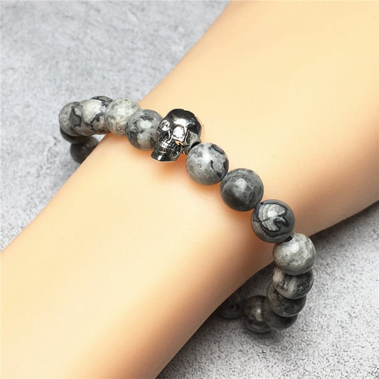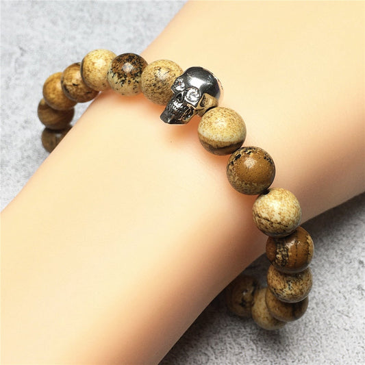 Gemstone Beaded Picasso Stone Elastic Stretch Bracelet Tattoo Skull Design