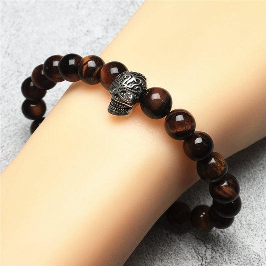 Gemstone Beaded Red Tiger Eye Stone Elastic Stretch Bracelet Tattoo Skull Design