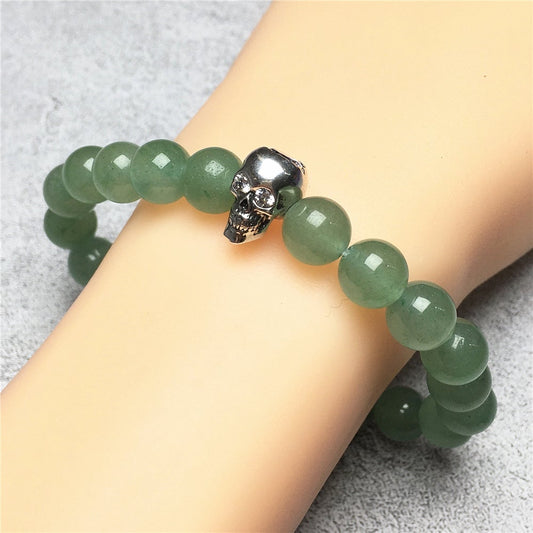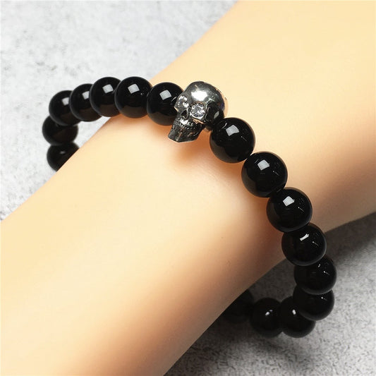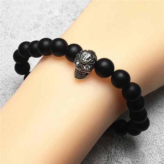 Gemstone Beaded Matte Onyx Stone Elastic Stretch Bracelet Tattoo Skull Design